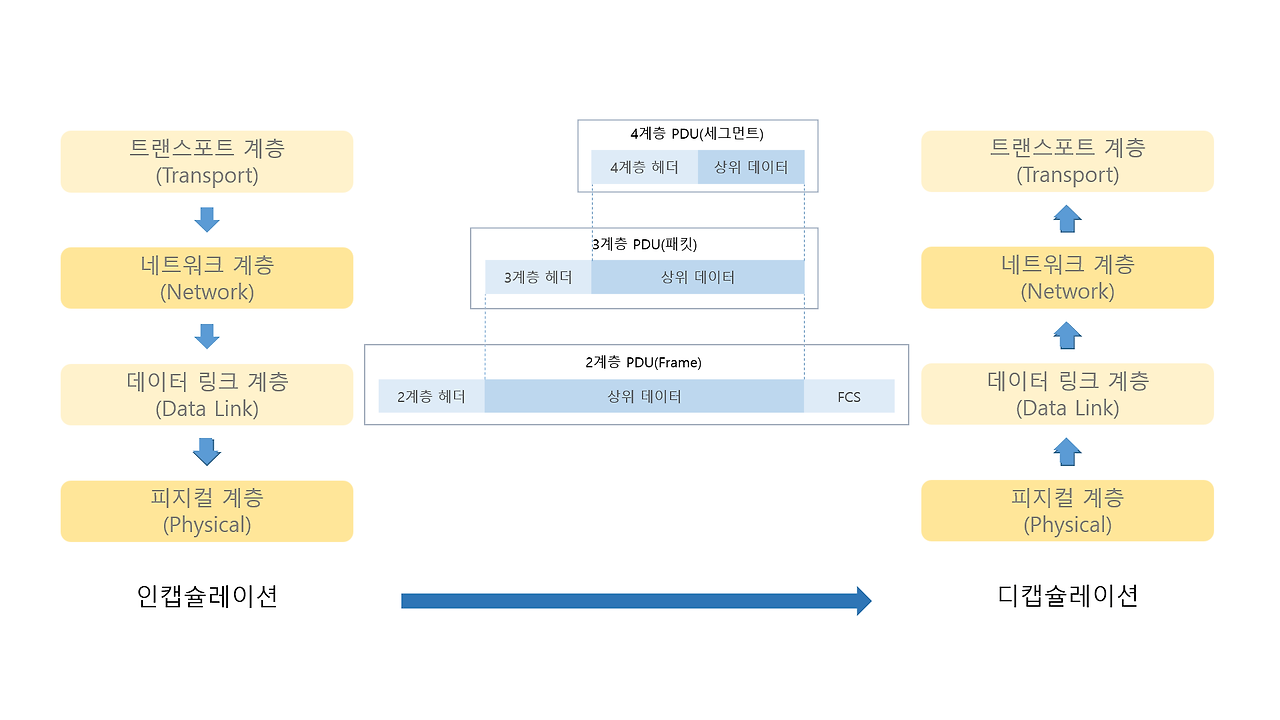 인캡슐레이션 : 하위계층에서 상위계층이 전송한 패킷을 자신의 패킷 데이터로 캡슐화 하는 과정